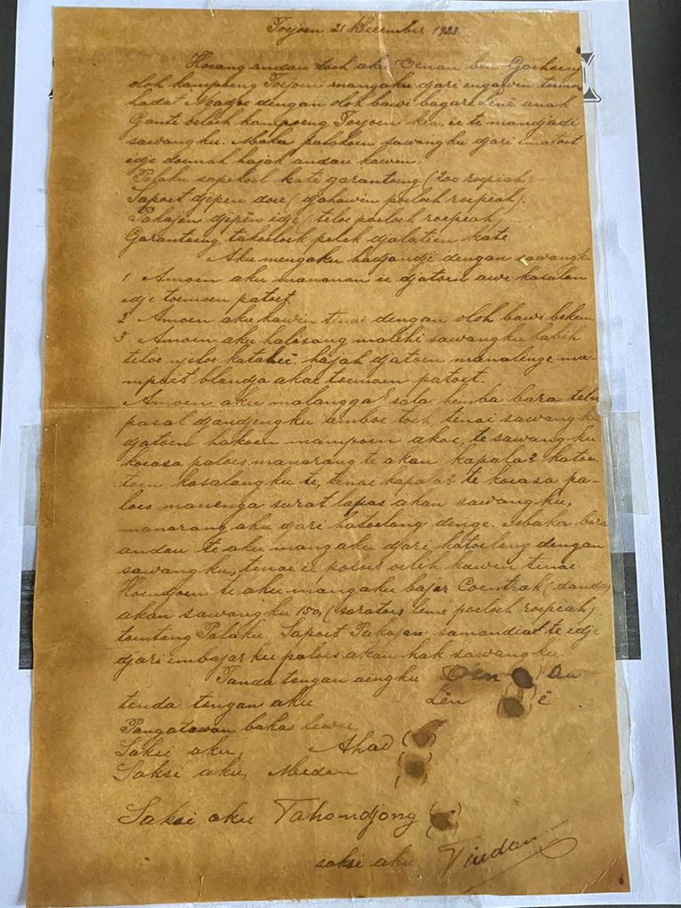 Perjanjian nikah yang ditemukan di Toejoen pada 21 Desember 1923 adalah naskah penting yang mencerminkan praktik pernikahan dalam budaya masyarakat Dayak Ngaju. Dalam konteks historis saat itu, Indonesia masih berada di bawah pemerintahan kolonial Belanda, namun tradisi dan adat istiadat lokal tetap dijunjung tinggi. Naskah ini mencakup berbagai aspek, termasuk pembayaran mahar, uang panjar, dan ketentuan mengenai tanggung jawab suami, seperti larangan menceraikan istri tanpa alasan yang sah. Hal ini menunjukkan adanya kesepakatan yang jelas mengenai perlindungan hak-hak istri dalam perkawinan, serta peran kepala desa dalam menyelesaikan perselisihan yang mungkin timbul.